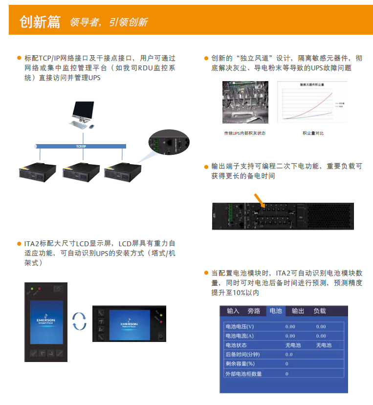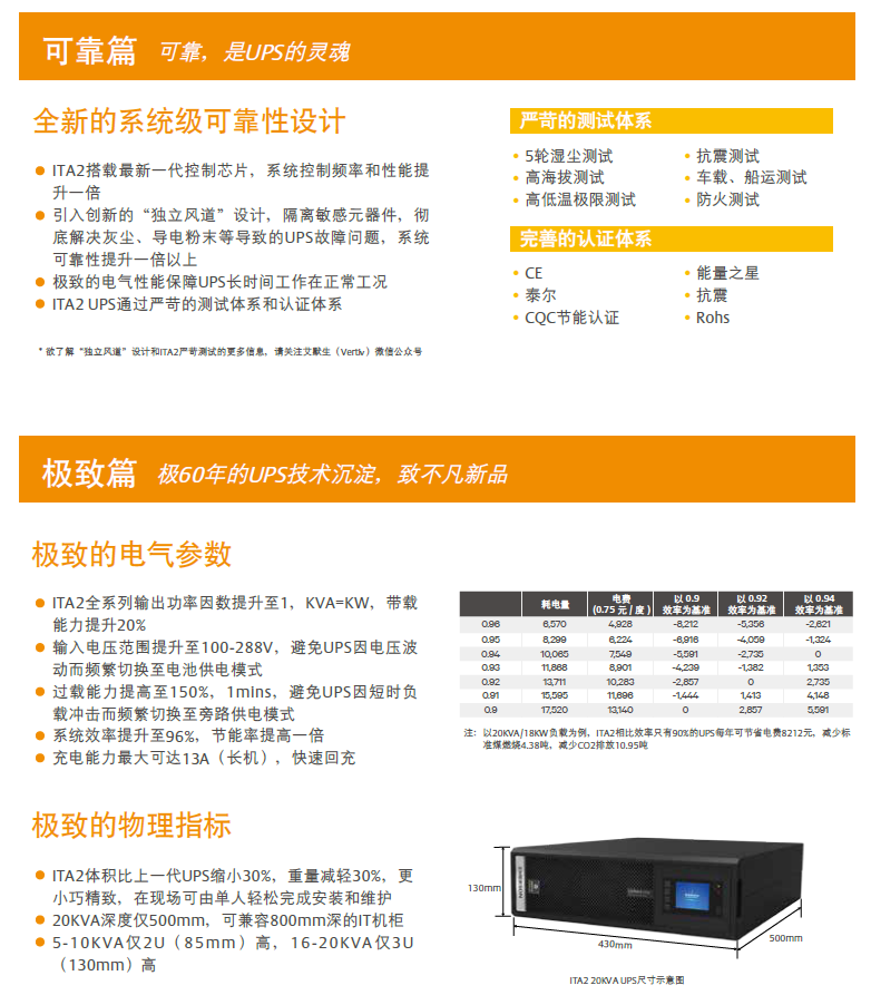 ITA2系列UPS是艾默生網(wǎng)絡(luò)能源有限公司憑借60年的UPS設(shè)計(jì)和制造經(jīng)驗(yàn),針對(duì)互聯(lián)網(wǎng)時(shí)代下市場(chǎng)提出的新需求而重磅推出的新一代小功率機(jī)架式UPS產(chǎn)品。ITA2系列UPS目前發(fā)布的容量為5-20KVA,它采用最新一代控制芯片,可以為系統(tǒng)提供更優(yōu)的控制頻率和性能,可以極大地提高負(fù)載和輸入源的適應(yīng)性。ITA2采用全新的系統(tǒng)設(shè)計(jì),極大地提升了產(chǎn)品可靠性并進(jìn)一步優(yōu)化了系統(tǒng)效率。ITA2應(yīng)用大量創(chuàng)新的設(shè)計(jì),可以靈活地應(yīng)用在各類場(chǎng)合。是客戶不間斷供電的首選產(chǎn)品,更是業(yè)界的新標(biāo)桿。
