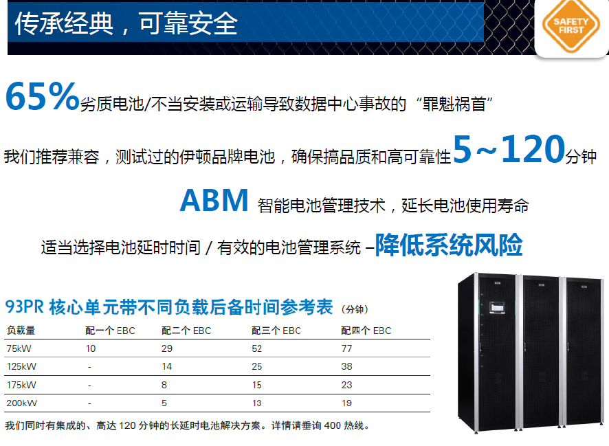 93PR模塊化UPS及關(guān)鍵電力保護(hù)系統(tǒng)采用當(dāng)今先進(jìn)的及伊頓專利的電力電子技術(shù),由伊頓全球團(tuán)隊(duì)傾心打造,符合高可靠性軍用等級要求,綜合設(shè)計(jì),系統(tǒng)測試和驗(yàn)證的系統(tǒng),減少大量因電池等部件導(dǎo)致的使用故障,確保客戶業(yè)務(wù)持續(xù)運(yùn)行。采用伊頓專利的三電平技術(shù),雙變化效率高達(dá)96.5%,交流直供模式下效率大于99%,有效降低客戶總體擁有成本(TCO)。可以全面滿足從網(wǎng)絡(luò)配線間、中小數(shù)據(jù)中心到大型數(shù)據(jù)中心的應(yīng)用及自動化或醫(yī)療等應(yīng)用場所的電力保障要求。