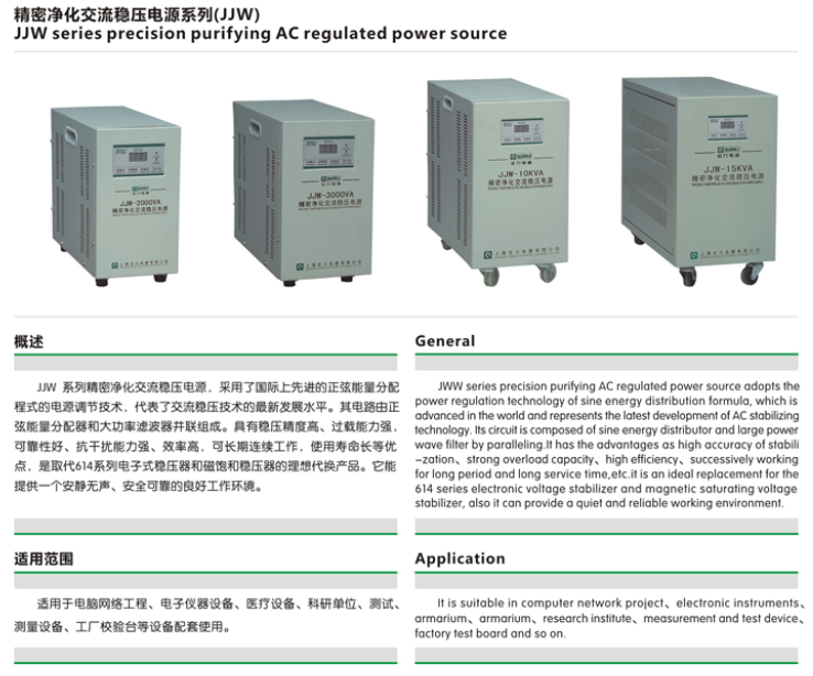 JJW系列精密凈化交流穩(wěn)壓電源,采用了國(guó)際上先進(jìn)的正弦能量分配 程式的電源調(diào)節(jié)技術(shù),代表了交流穩(wěn)壓技術(shù)的最新發(fā)展水平。其電路由正 弦能量分配器和大功率濾波器并聯(lián)組成。具有穩(wěn)壓精度高、過(guò)載能力強(qiáng), 可靠性好、抗干擾能力強(qiáng)、效率高,可長(zhǎng)期連續(xù)工作,使用壽命長(zhǎng)等優(yōu) 點(diǎn),是取代614系列電子式穩(wěn)壓器和磁飽和穩(wěn)壓器的理想代換產(chǎn)品。它能 提供一個(gè)安靜無(wú)聲、安全可靠的良好工作環(huán)境。 適用范圍 適用于電腦網(wǎng)絡(luò)工程、電子儀器設(shè)備、醫(yī)療設(shè)備、科研單位、測(cè)試、 測(cè)量設(shè)備、工廠校驗(yàn)臺(tái)等設(shè)備配套使用。