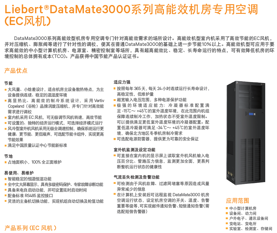 Vertiv Liebert DataMate3000 系列高能效型機(jī)房專用空調(diào)專門針對(duì)高能效需求的場(chǎng)所設(shè)計(jì),比普通機(jī)房空調(diào)進(jìn)一步節(jié)能10%以上。可應(yīng)用于中小型計(jì)算機(jī)機(jī)房、電源室、精密控制室等場(chǎng)所,具有超高能效比、穩(wěn)定、長壽命運(yùn)行的特點(diǎn),可有效降低機(jī)房的總體擁有成本(TCO)。