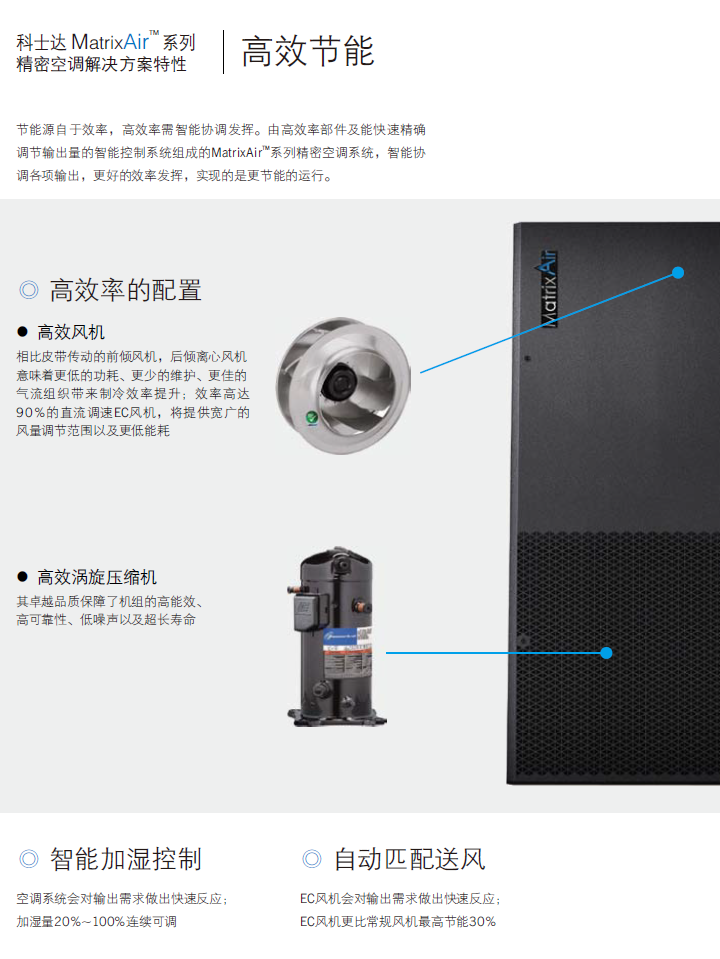 科士達MatrixAir系列精密空調(diào)融合業(yè)界先進的節(jié)能環(huán)保技術(shù),依托全面的開發(fā)工具和技術(shù)資源按高標(biāo)準(zhǔn)精心設(shè)計而成,以高品質(zhì)的系統(tǒng)設(shè)計確保機組的高可靠性,是關(guān)鍵制冷行業(yè)先進可靠、高效節(jié)能和安全環(huán)保的新一代產(chǎn)品。可保障數(shù)據(jù)中心關(guān)鍵IT設(shè)備全年365天×24小時不間斷高效可靠運行。