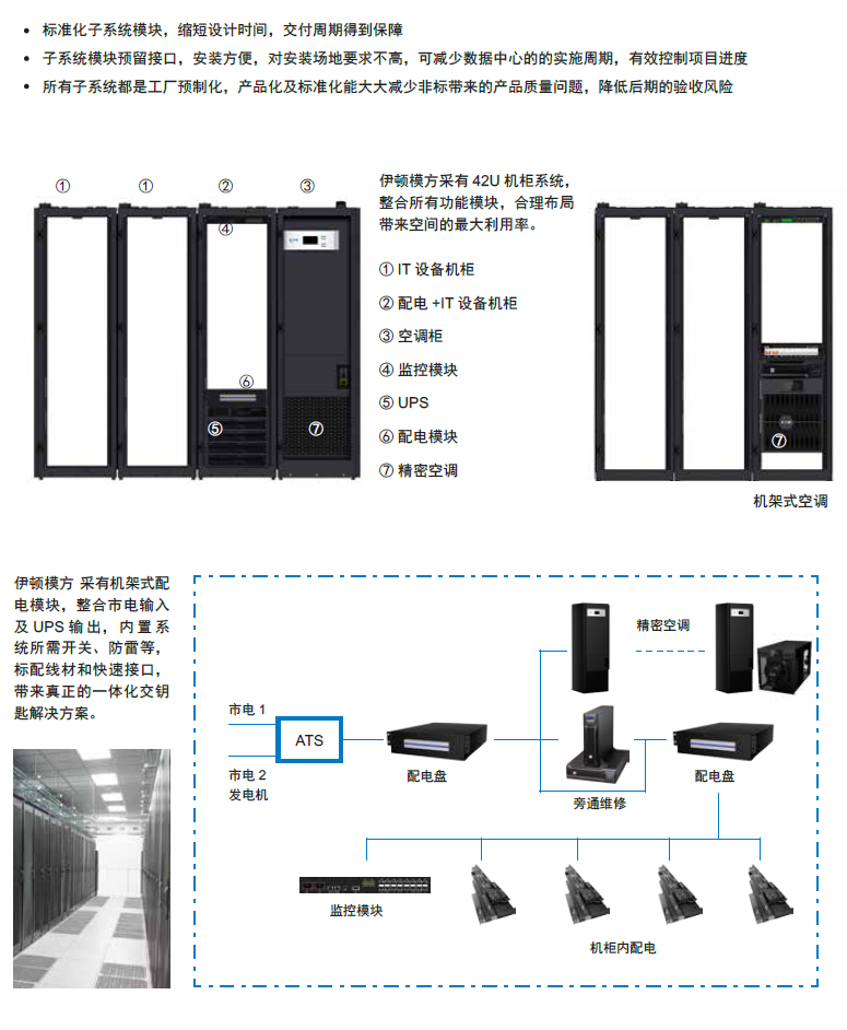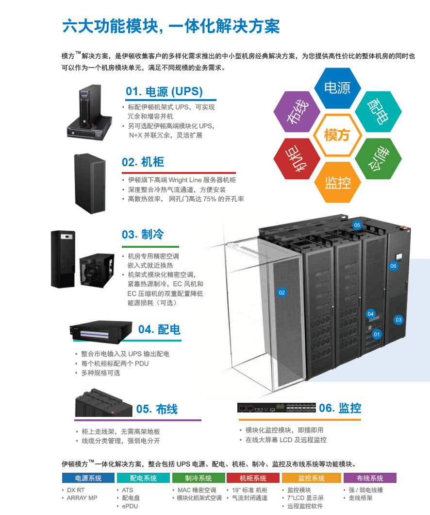數(shù)據(jù)中心產(chǎn)業(yè)開始向綠色化、標(biāo)準(zhǔn)化、模塊化發(fā)展。 能耗偏高及無(wú)法迅速適應(yīng)用戶快速轉(zhuǎn)變的需求是當(dāng)今數(shù)據(jù)中 心面臨的兩大問題。中小型數(shù)據(jù)中心承載企事業(yè)單位、機(jī)構(gòu)或分支機(jī)構(gòu)等的核心業(yè)務(wù),構(gòu)建初期更應(yīng)該注重節(jié)能和 可持續(xù)發(fā)展。 模方?解決方案,是伊頓收集客戶的多樣化需求推出的中小型機(jī)房經(jīng)典解決方案,為您提供高性價(jià)比的整體機(jī)房的同時(shí)也 可以作為一個(gè)機(jī)房模塊單元,滿足不同規(guī)模的業(yè)務(wù)需求。 伊頓模方?一體化解決方案,整合包括UPS 電源、配電、機(jī)柜、制冷、監(jiān)控及布線系統(tǒng)等功能模塊。 伊頓模方TM IT空間的智慧之選 應(yīng)用范圍 解決方案 物理架構(gòu)是數(shù)據(jù)中心的基礎(chǔ),是IT 業(yè)務(wù)可靠運(yùn)營(yíng)的關(guān)鍵層。 伊頓 模方TM,無(wú)縫整合數(shù)據(jù)中心物理基礎(chǔ)設(shè)施,提供高效綠色的模塊化 一體解決方案,從容應(yīng)對(duì)供電、制冷、擴(kuò)容、管理等幾個(gè)方面帶來 的挑戰(zhàn)。將幫助您構(gòu)建一個(gè)可靠、高效、安全的數(shù)據(jù)中心。