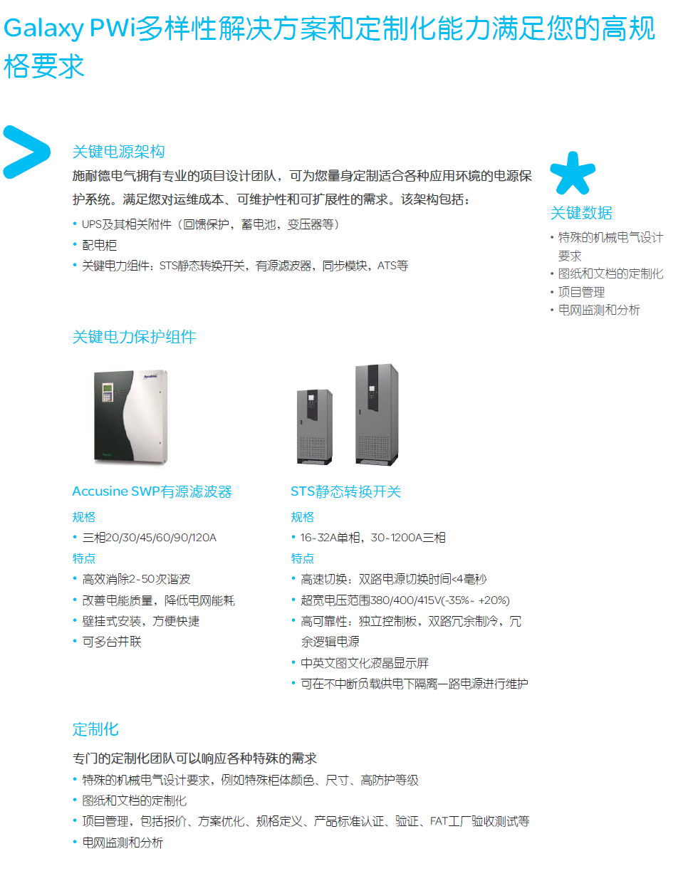尋找一種“能夠適應(yīng)環(huán)境、滿足負(fù)載要求、綜藝應(yīng)用成本低”的解決方案,面對這些挑戰(zhàn),作為您合作伙伴的施耐德電氣公司將會提供Galaxy Pwi以滿足您的迫切需求。
